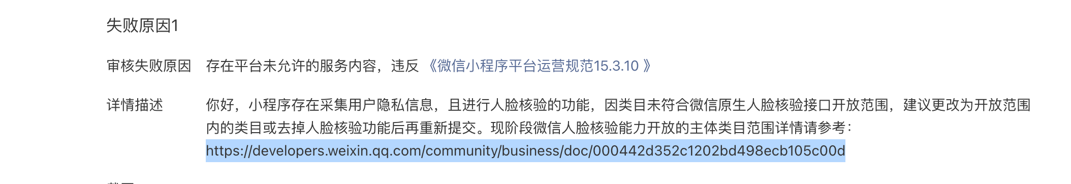 2、小程序如果涉及用户本人的生物特征采集,(如本人人脸照片、人脸视频),或涉及采集用户本人生物特征信息并开展人脸核验功能,则存在被驳回的情况?