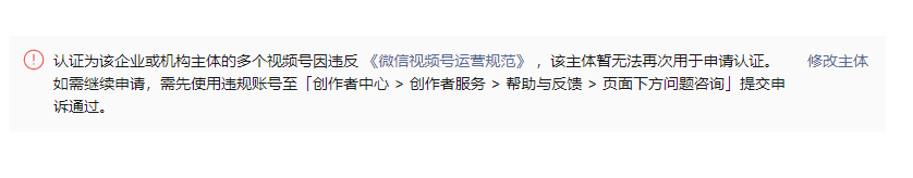 这个不是告诉你了吗,你登录你这个主体认证的所有视频号,找到违规账号,在【创作者中心>创作者服务>帮助与反馈>页面下方问题咨询】提交反馈申诉并通过后,才能再次申请企业认证。