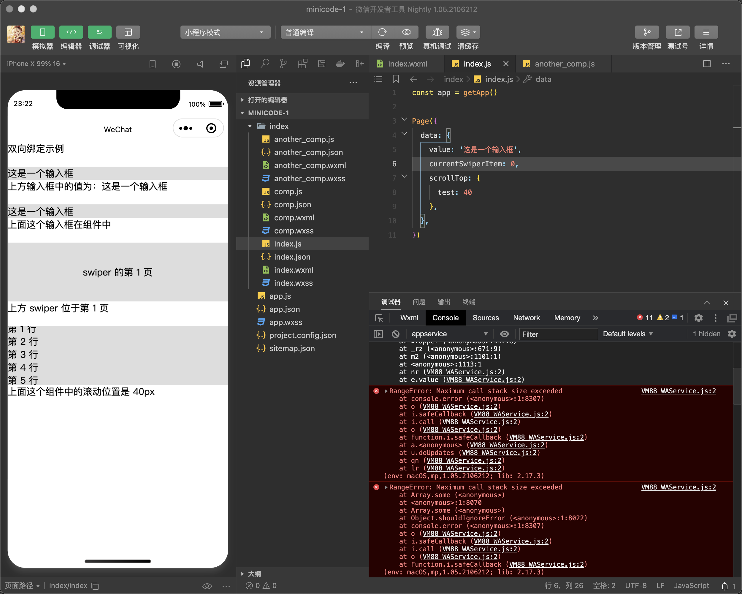 这个截图是我修改了官方的model双向绑定的demo,我把原本的String类型改成Object类型之后控制台报错内存溢出,难道双向绑定只是支持String和Number?会不会太鸡肋了 这个功能。。