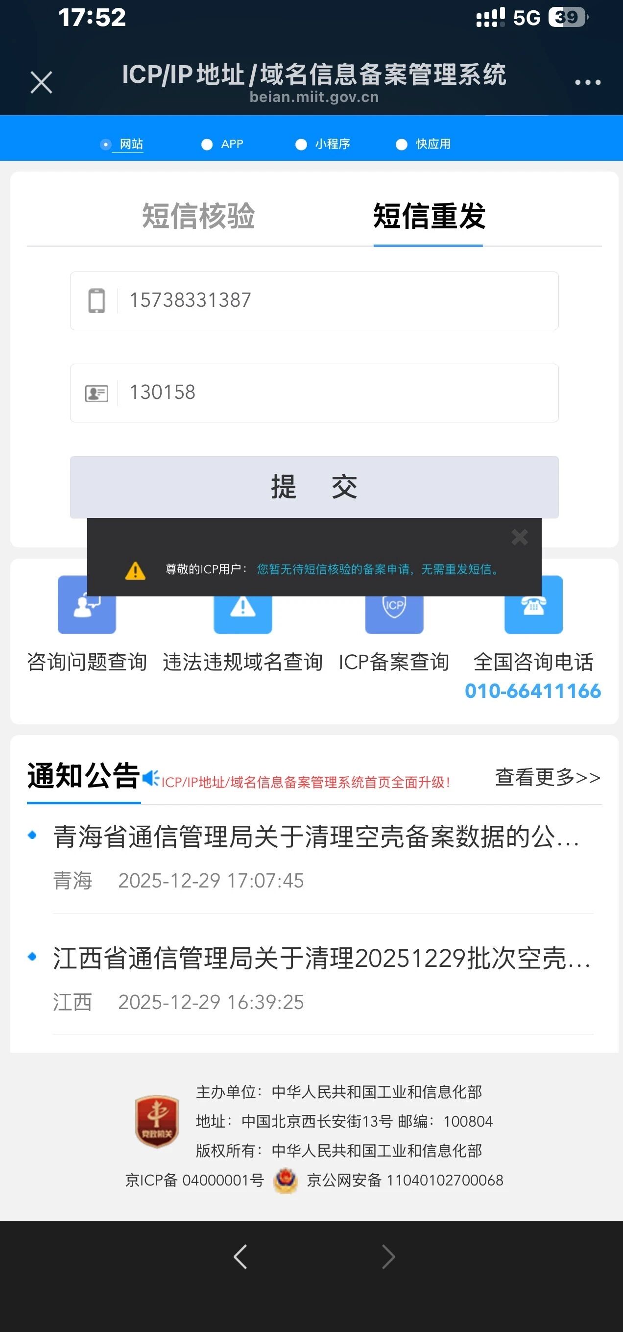 小程序备案,不一定都会收到短信核验。登录小程序后台,查看备案状态,如果是管局审核,等待审核结果就行了。