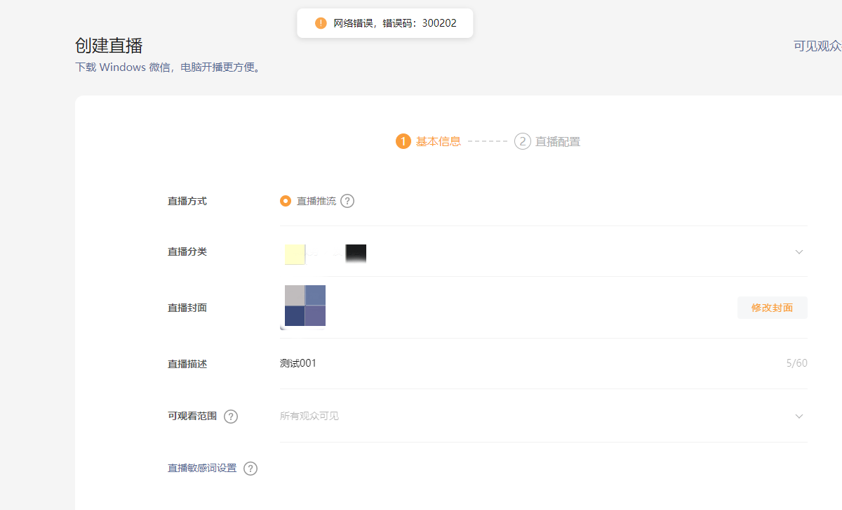 视频号创建直播时出现网络错误提示