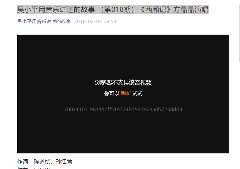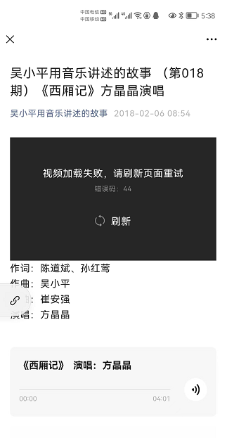 我发过一我发过一则“吴小平用音乐讲述的故事 (第018期)《西厢记》方晶晶演唱”的图文消息,现在视频打不开,手机提示错误错误码44.网页上提示不支持该音视频则“吴小平用音乐讲述的故事 (第018期)《西厢记》方晶晶演唱”的图文消息,现在视频打不开,手机提示错误错误码44.网页上提示不支持该音视频