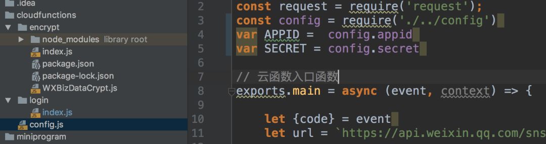 其中config.js是我的配置文件,里边是我的appid和secret,当我在login/index.js用的时候竟然用不到,是不是说函数不能访问外层资源?