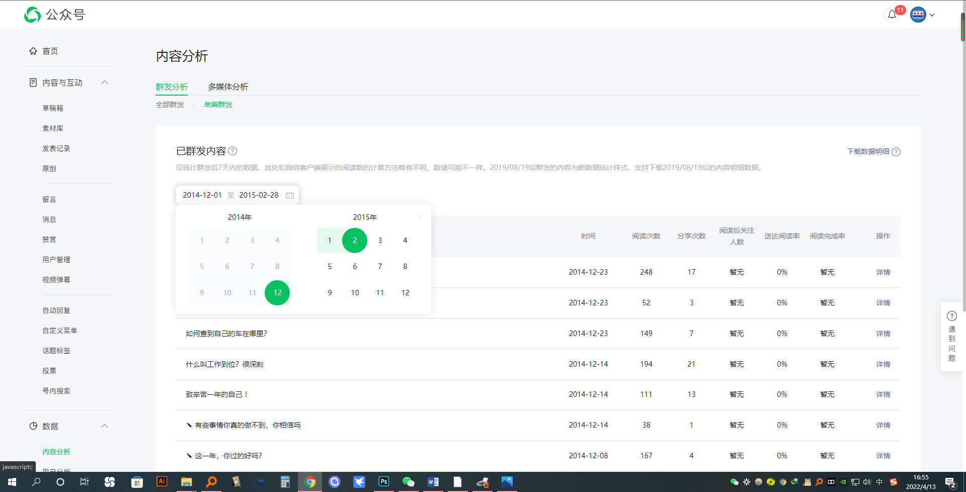你好,我们需要查一下我们公众号“三连星”2014年3月12日的一个文章的阅读数据,时间选择只能够选到2014年12月,请求您帮助!