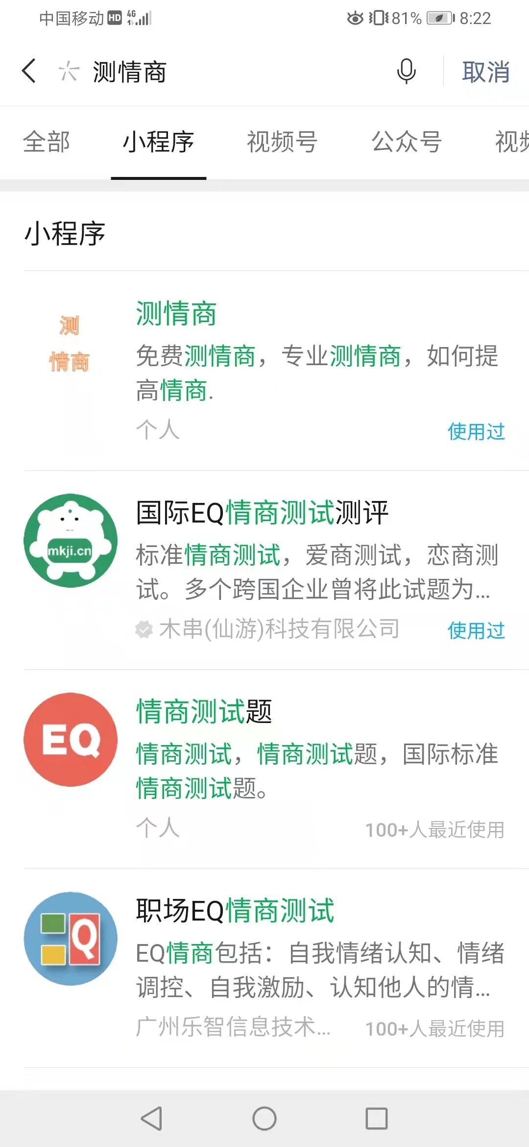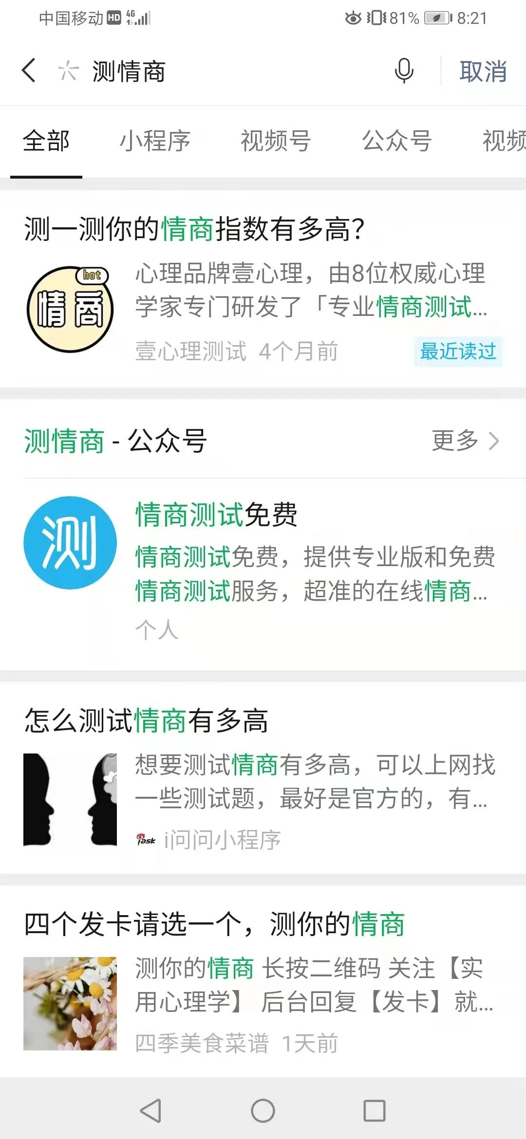 我个人觉得,这个跟搜索范围有关系。如果将搜索范围设置成“全部”,那么搜索引擎将会在后台数据库中匹配所有跟“测情商”有关的内容,包括文章、公众号等等;而且从搜索结果来看,搜索过程中用到了自然语言处理相关的算法,所有跟“测情商”语义相关的结果都会被匹配出来,显然这样搜索范围过大,结果的准确性难以保障。如果将搜索范围设置成“小程序”,那么后台只会去查找同时跟“测情商”和“公众号”有关的内容,这样准确性就会大大提高,小程序就会被搜索出来了。
