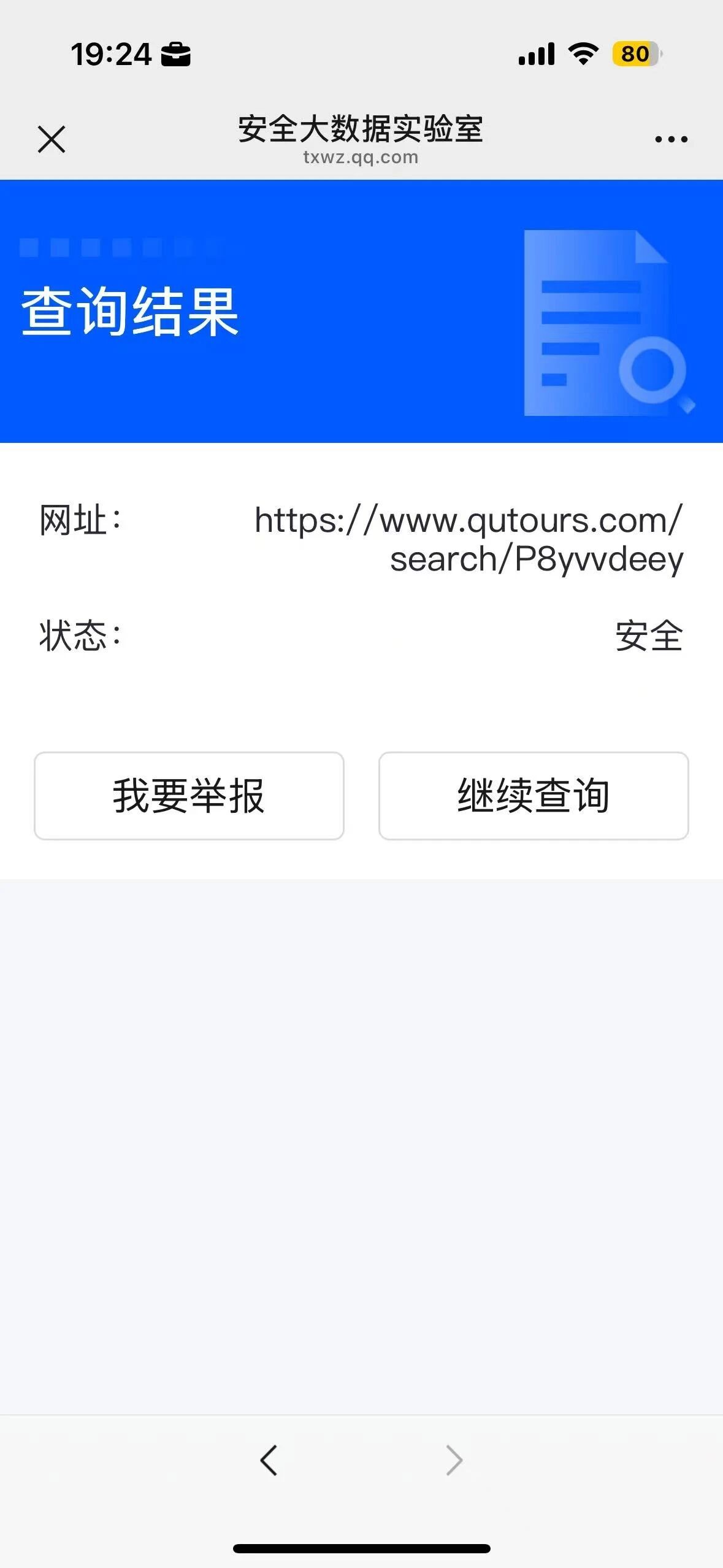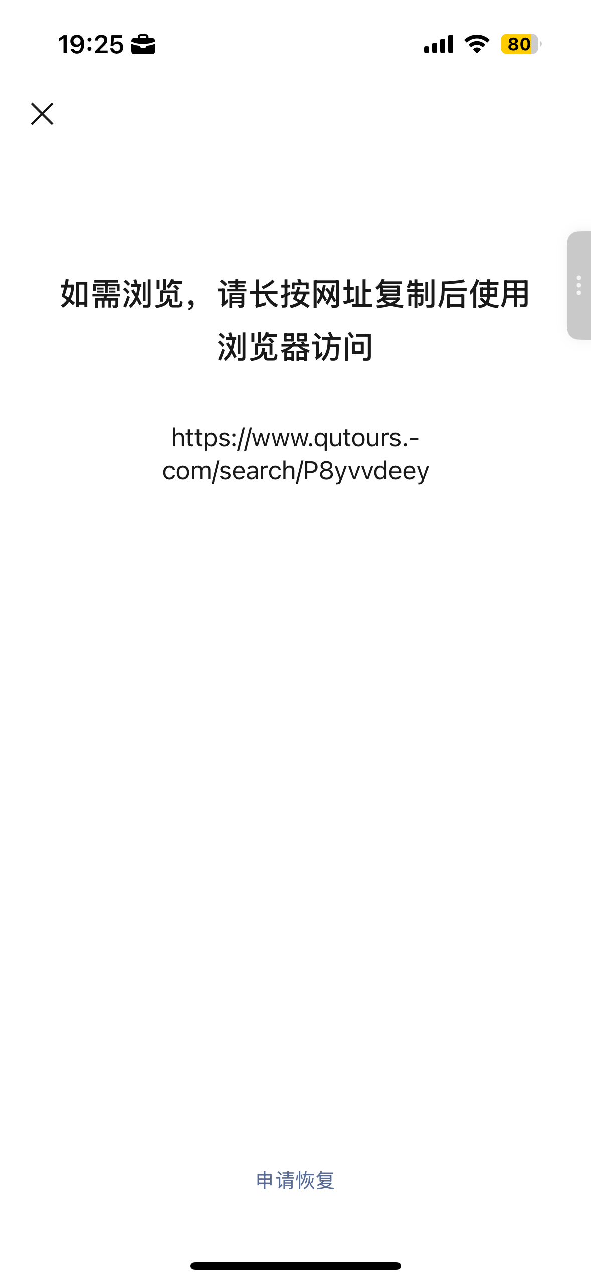 网站地址(https://www.qutours.com/search/P8yvvdeey)没有违规和不安全信息,并已在工信网备案和通过腾讯网址安全中心检测,没有发现任何风险,但微信内打开却提示:"如需浏览,请长按网址复制后使用浏览器访问",请帮忙核实和处理!