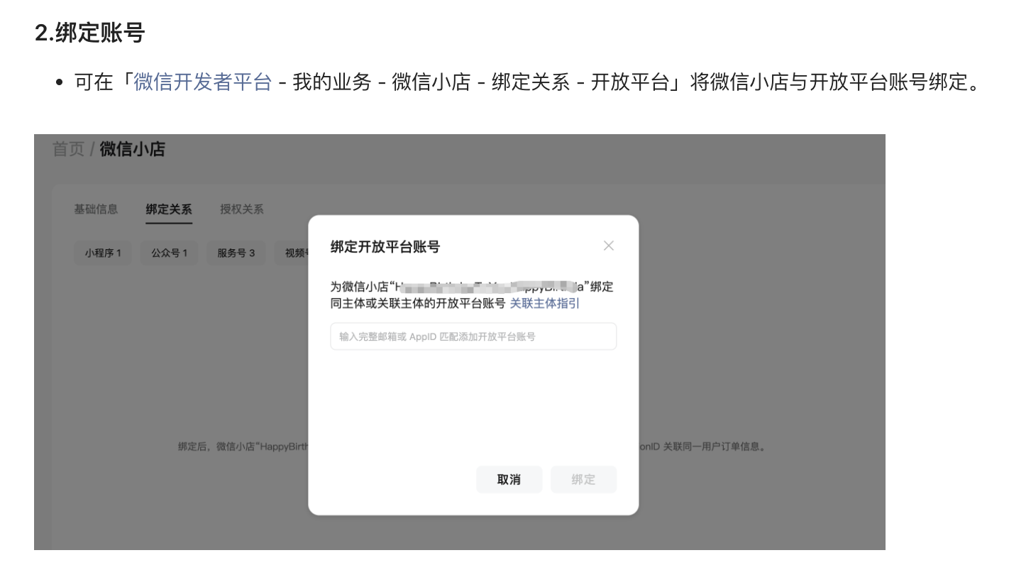 可在「微信开发者平台 - 我的业务 - 微信小店 - 绑定关系 - 开放平台」将微信小店与开放平台账号绑定哈,详情可查看:https://developers.weixin.qq.com/doc/store/shop/dev_before/bindOpen.html