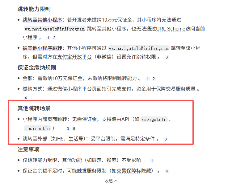 2.对于含有实物商品交易的小程序,平台为了确保用户的使用体验,在未满足以下条件的情况下暂不支持跳入跳出的能力。详细信息请参考:实物交易类小程序跳转规范请参考https://mp.weixin.qq.com/cgi-bin/announce?action=getannouncement&key=11736404407Ko3H2&version=1&lang=zh_CN&platform=2