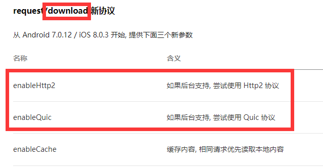 请问官方,这是文档错误,还是BUG?下面这个图,上面是用wx.request,下面是用wx.downloadFile,都打开了enableHttp2选项。但只有wx.request的HTTP/2生效了,wx.downloadFile仍然是以HTTP/2下载的。这些请求,在浏览器中直接访问,都是以HTTP/2访问的。