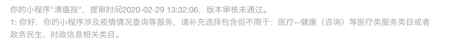 你好,经核实,你的小程序涉及疫情情况查询等服务,请补充选择包含但不限于:医疗--健康(咨询)等医疗类服务类目或者政务民生、时政信息相关类目。