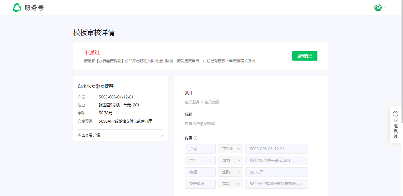 您好!我们能源公司,经营有自来水、再生水,所以标题只有水费,用户不好区分。为什么不让通过呢?
