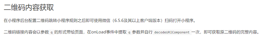 let that = this let q = decodeURIComponent(that.options.q) let a = q.split('=')[1]// 入口处加段代码适配下 if (options.scancode_time){ decodeURIComponent(options.q).split('?')[1].split('&').map((item)=>{ const si = item.split('=') options[si[0]] = si[1] }) }https://developers.weixin.qq.com/miniprogram/introduction/qrcode.html#%E4%BA%8C%E7%BB%B4%E7%A0%81%E5%86%85%E5%AE%B9%E8%8E%B7%E5%8F%96
