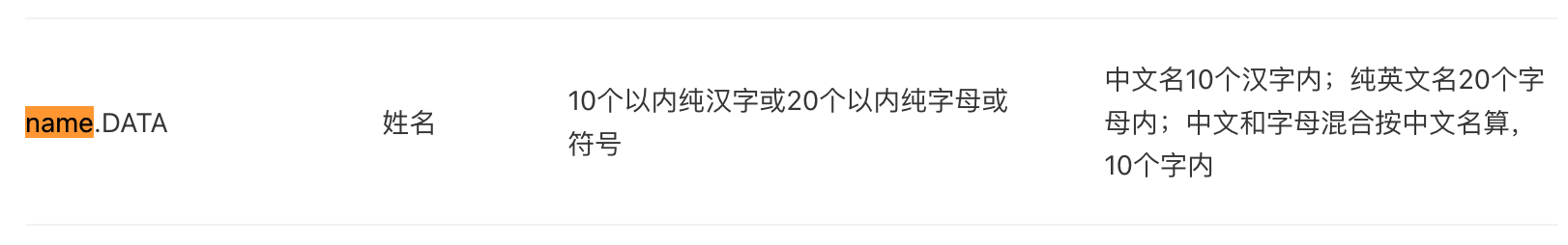 name 字段限制:10个以内纯汉字或20个以内纯字母或符号。