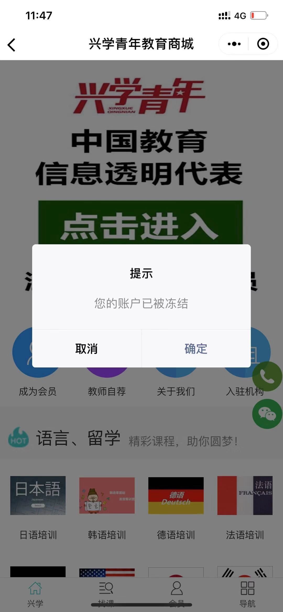 这个提示的意思不是小程序账号被冻结了,是登陆这个小程序的账号被小程序冻结了,引导联系小程序的开发者去看