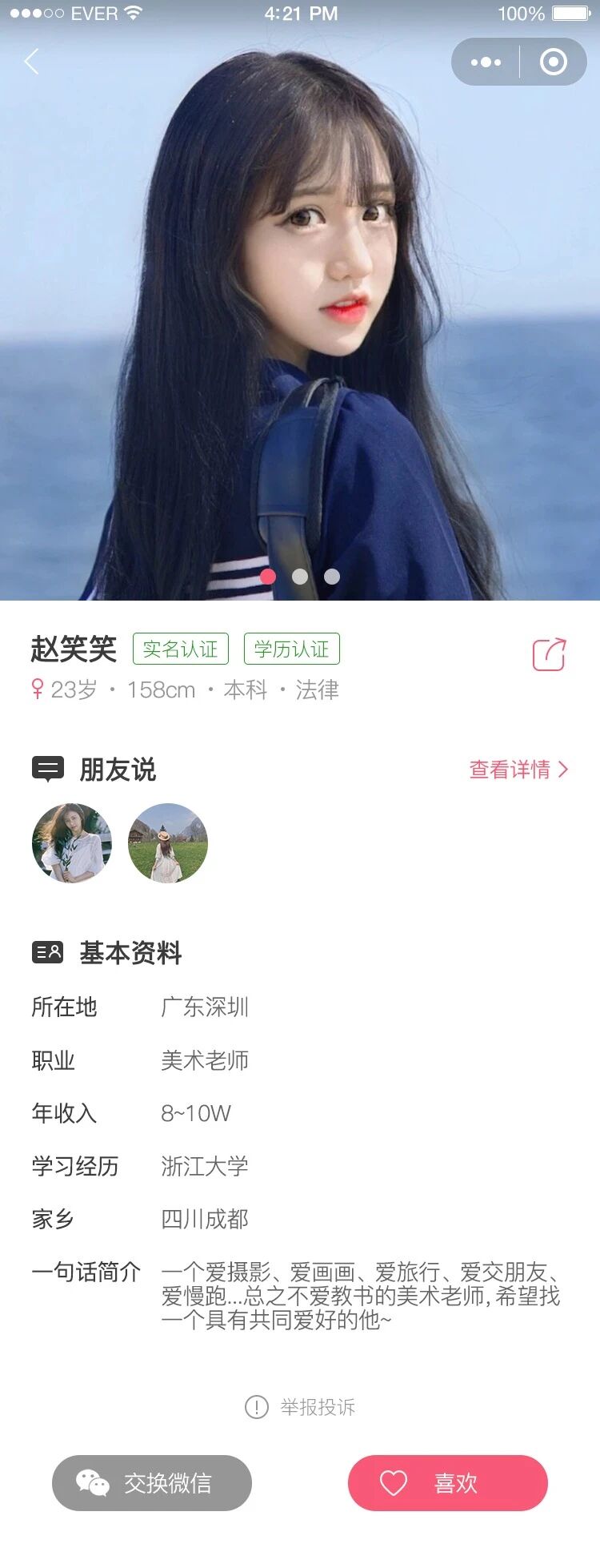 3、若您喜欢某位异性,可在ta的个人主页点击“喜欢”,她收到提醒后,若ta也喜欢了你,可以相互交换微信号。