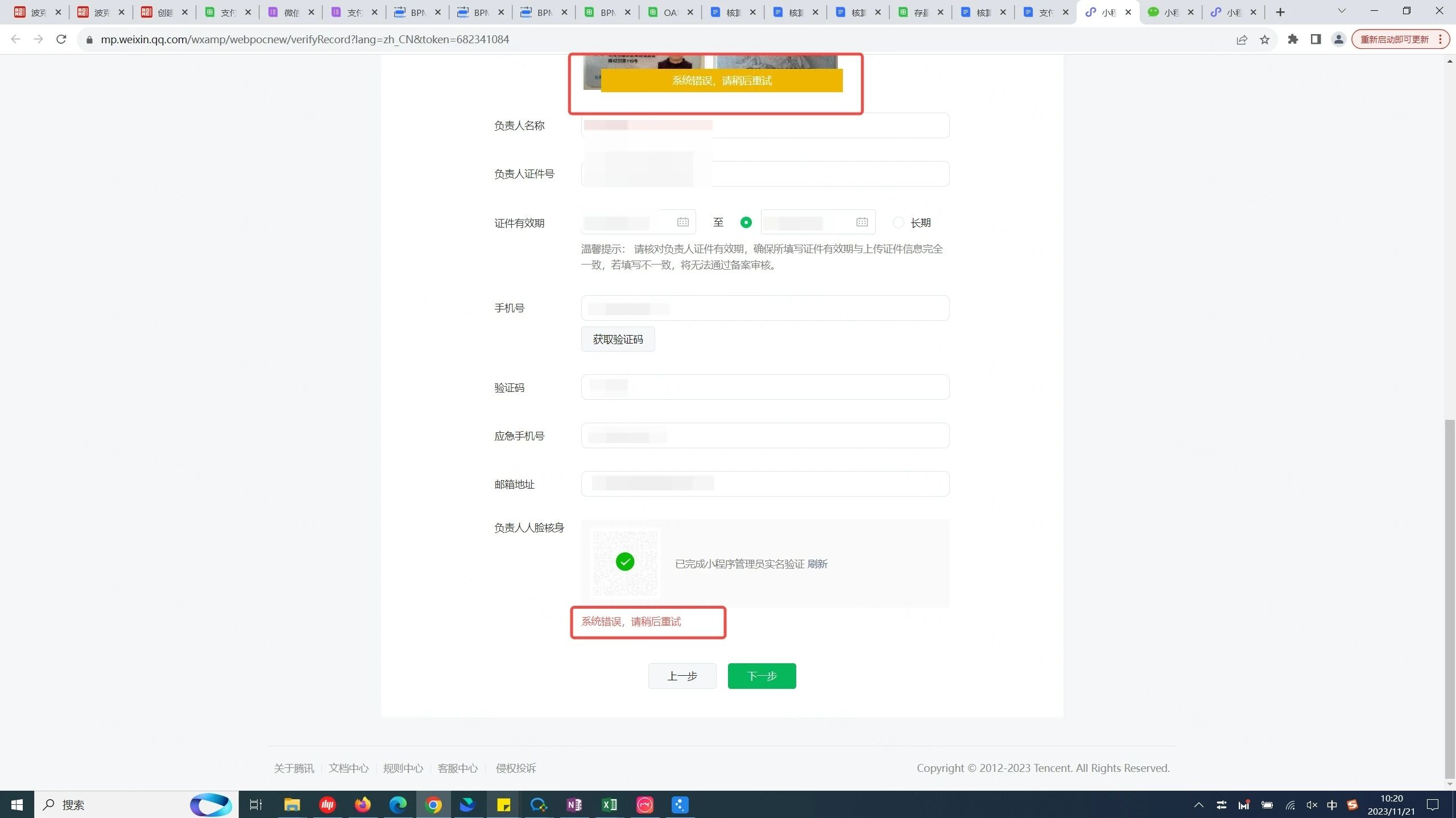 填完小程序负责人信息、做好人脸验证之后,无法提交备案信息,一直提示“系统错误,请稍后重试”。试了好几天都不行,请运营老师帮忙尽快解决,谢谢!