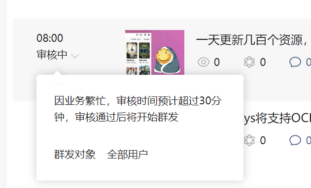 你好,我昨天就定时好了,今天没有群发,显示业务繁忙。现在过去了一个多小时了,还是没有发布成功。