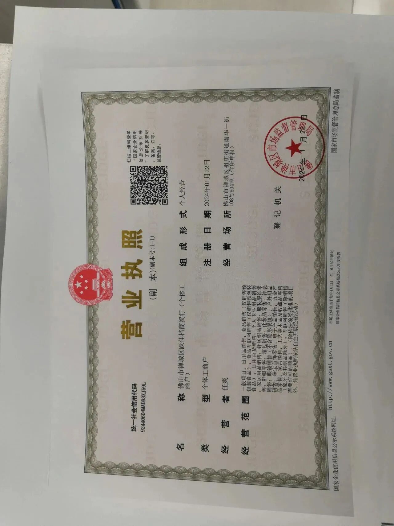 企业名称:佛山市禅城区跃佳楷商贸行 (个体工商户)