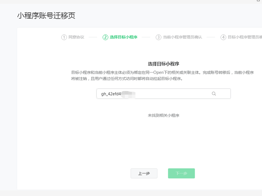 1)“小程序账号迁移”中目标小程序主体与原小程序主体必须为绑定在同一Open下的相同主体或关联主体,但不包括境外主体。