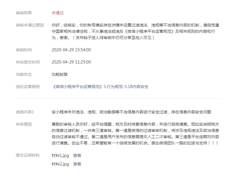 你好,经核实,你的帐号确实存在涉嫌未设置过滤违法、违规等不当信息内容的机制,请自觉遵守国家相关法律法规,不从事违法或违反《微信小程序平台运营规范》及相关规则的内容和行为,谢谢。(评论帖子-编辑中可分享至他人可见)