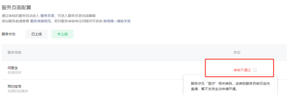 在配置官方服务时,审核没有通过,显示涉及“医疗”不支持,是所有私立机构都不能开通官方区吗?