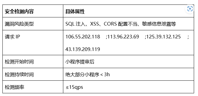 你好,目前安全检测请求均以较低速率进行,正常情况下不会影响小程序的正常服务。具体的检测频率可参考