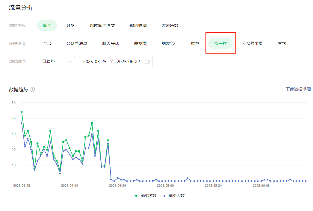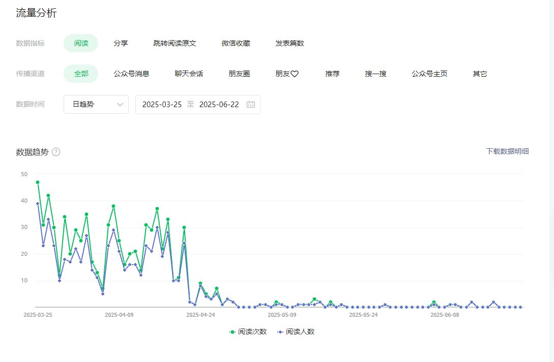 1、4月底阅读量持续下降,后面基本为0。发布的文章内容只有标题能搜到,关键词搜索不到;