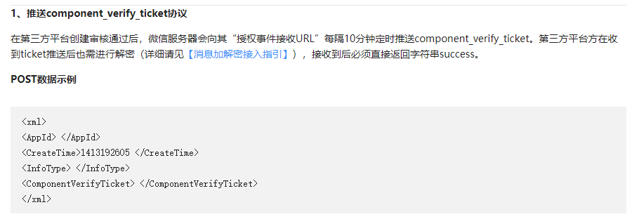 推送component_verify_ticket协议有没有详细文档,我接收的数据和你们的文档不一致?