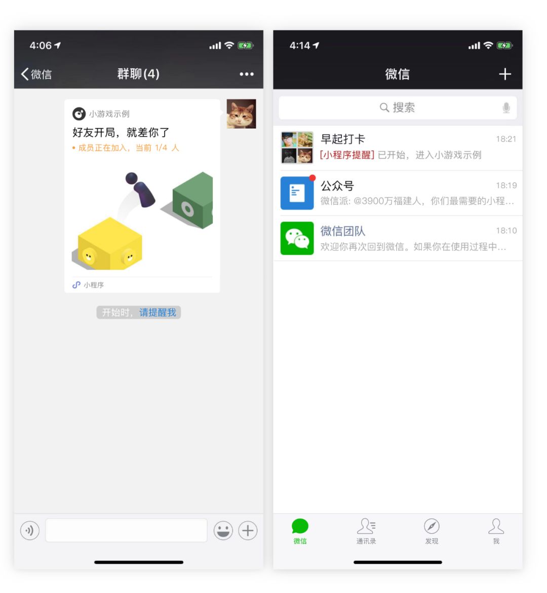 01 — 附近的小程序功能升级 1. 分类导航:新增外送、预约、出行等快捷入口,帮助用户更快找到所需的线下服务。 2. 服务标签:新增点餐、快递等十多种标签展示,帮助用户更清晰筛选服务信息。 3. 在线客服展示:支持用户查找门店服务时快速打开客服对话窗口,向在线客服人员进行咨询。 4. 门店地址页:基于地理位置的服务内容需绑定真实门店地址,便于用户精准定位。 此次升级,小程序开发者和公众号运营者可重点关注:开放的十多种标准服务认证、在线客服设置、门店页信息的补充认证。服务信息的完整补充将有助于获得更多用户的使用,详见《附近的小程序升级指引》。 02 — 更多小程序新能力 1. 小程序和小游戏的群分享卡片,支持实时显示活动参与人数。分享者及点击过该卡片的参与者,可使用“请提醒我”按钮,接收活动开始提醒,及时获取活动状态,详见《动态消息》。 2. 小程序支持与同一局域网内的设备进行网络通信,可实现操控智能硬件、为智能硬件配置网络等功能,详见《局域网通信》。 3. 当用户旋转手机时,小程序页面支持同步旋转,详见《小程序开发文档》。 4. 小程序新增图片压缩接口,当用户选择图片后,开发者可以按需设置压缩比例进行压缩,详见《小程序开发文档》。 5. 小程序跳转小程序功能调整为:单个小程序最多可跳转10个其他小程序,详见《小程序跳小程序调整》。 更多新能力及详情,可查看《更新日志》。