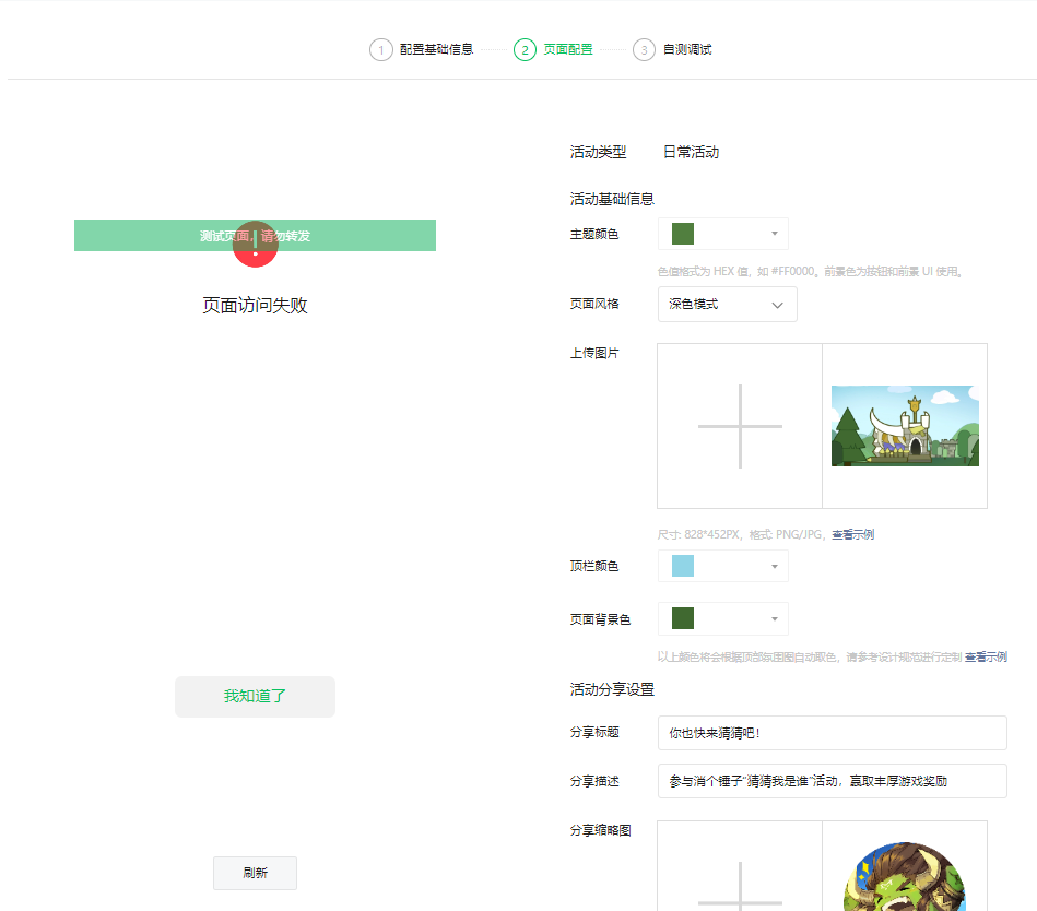 后台-游戏运营工具箱-活动运营工具-活动编辑,在按照步骤新建了活动之后始终无法预览,显示“页面访问失败”,尝试过重新新建、换浏览器、清除数据重新登录等方式,都还是访问失败,很多天了,影响游戏圈活动搭建,请问怎么解决?