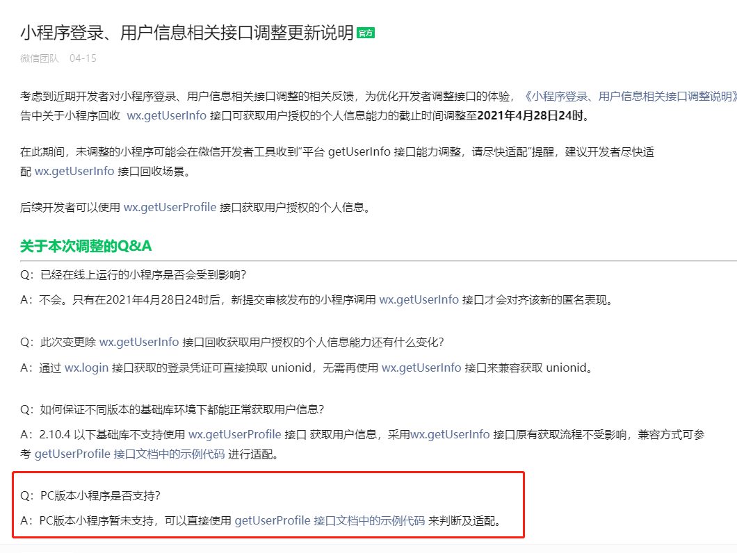 PC端 调用 wx.getUserProfile 此接口 警告报错 wx.getUserProfile is not a function