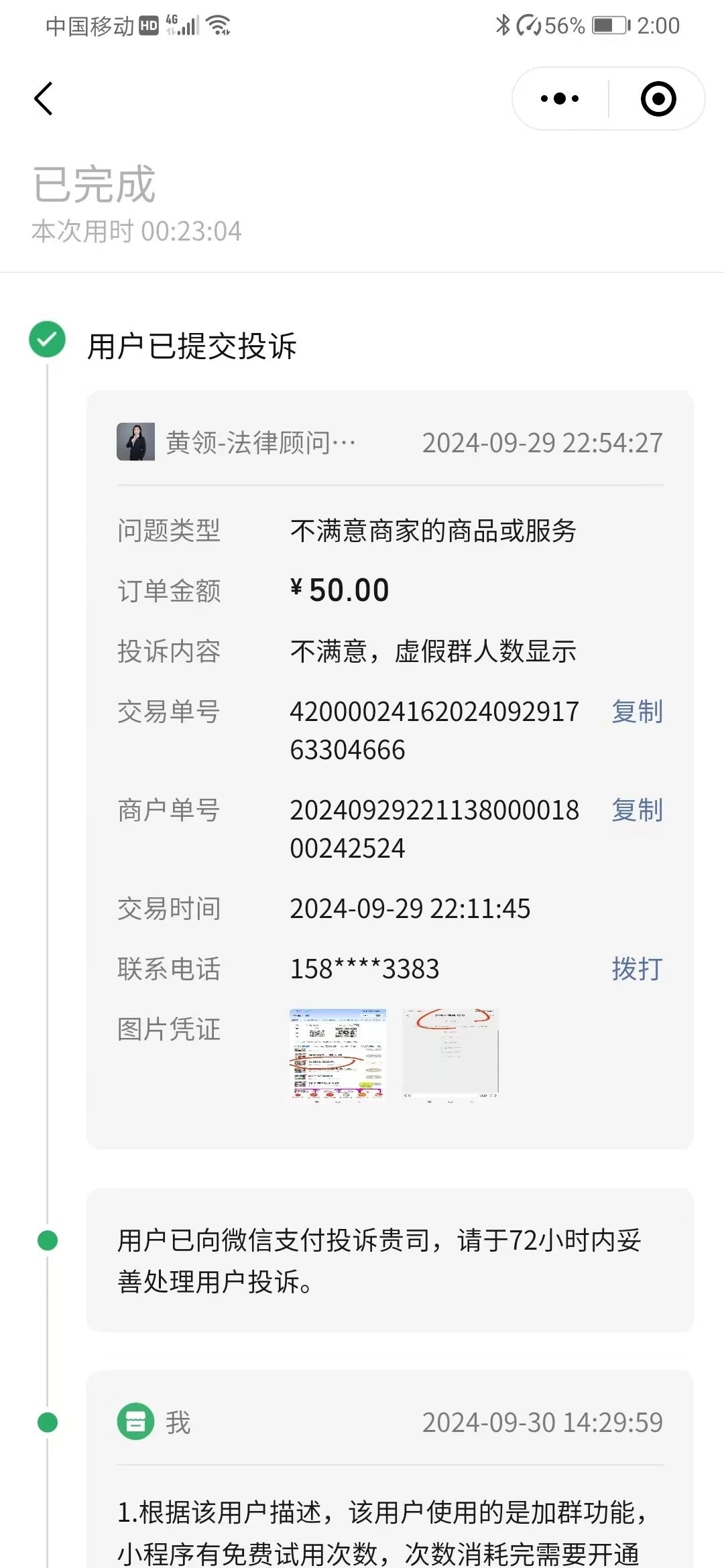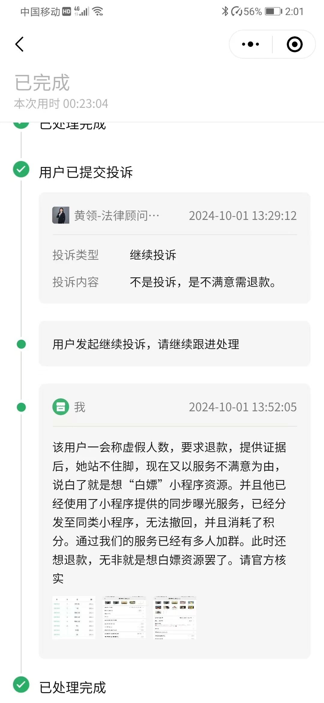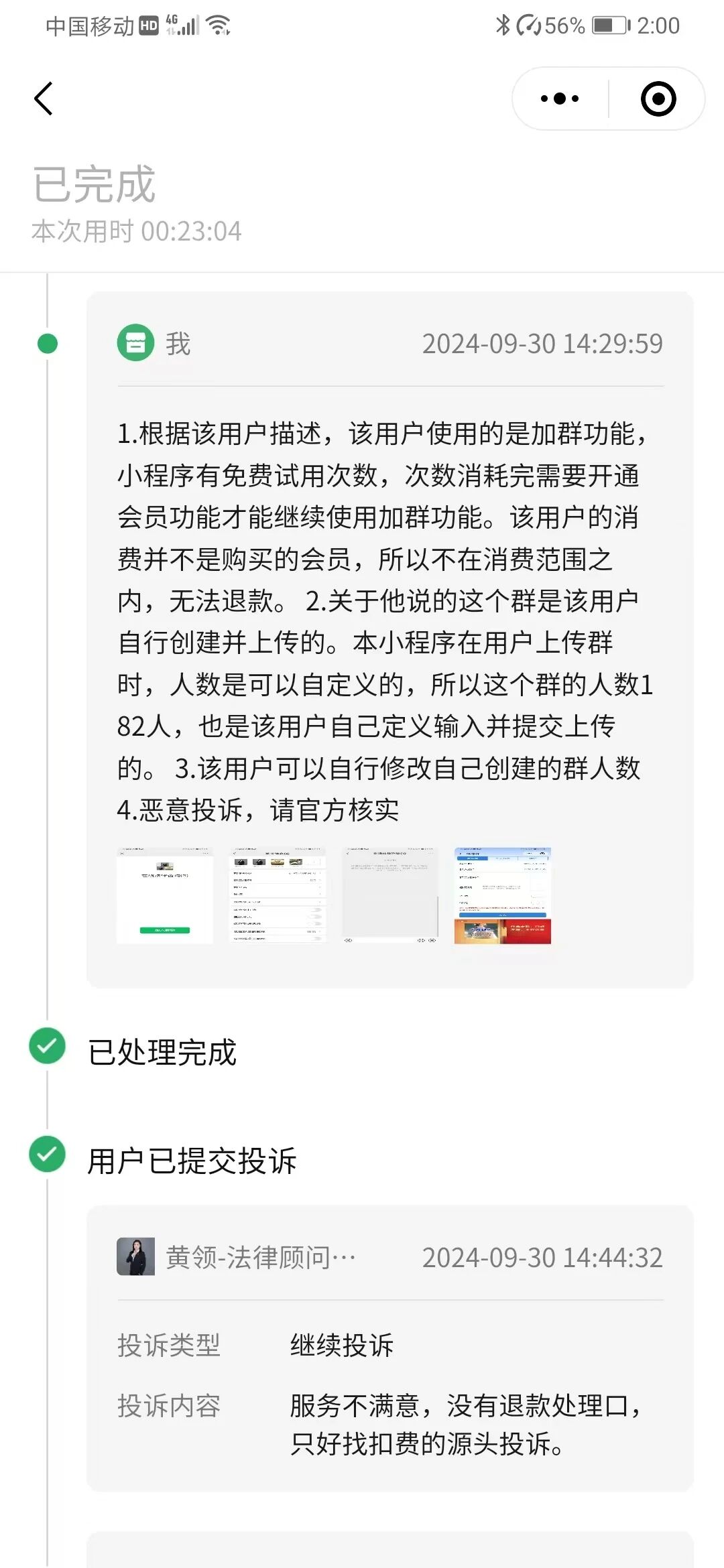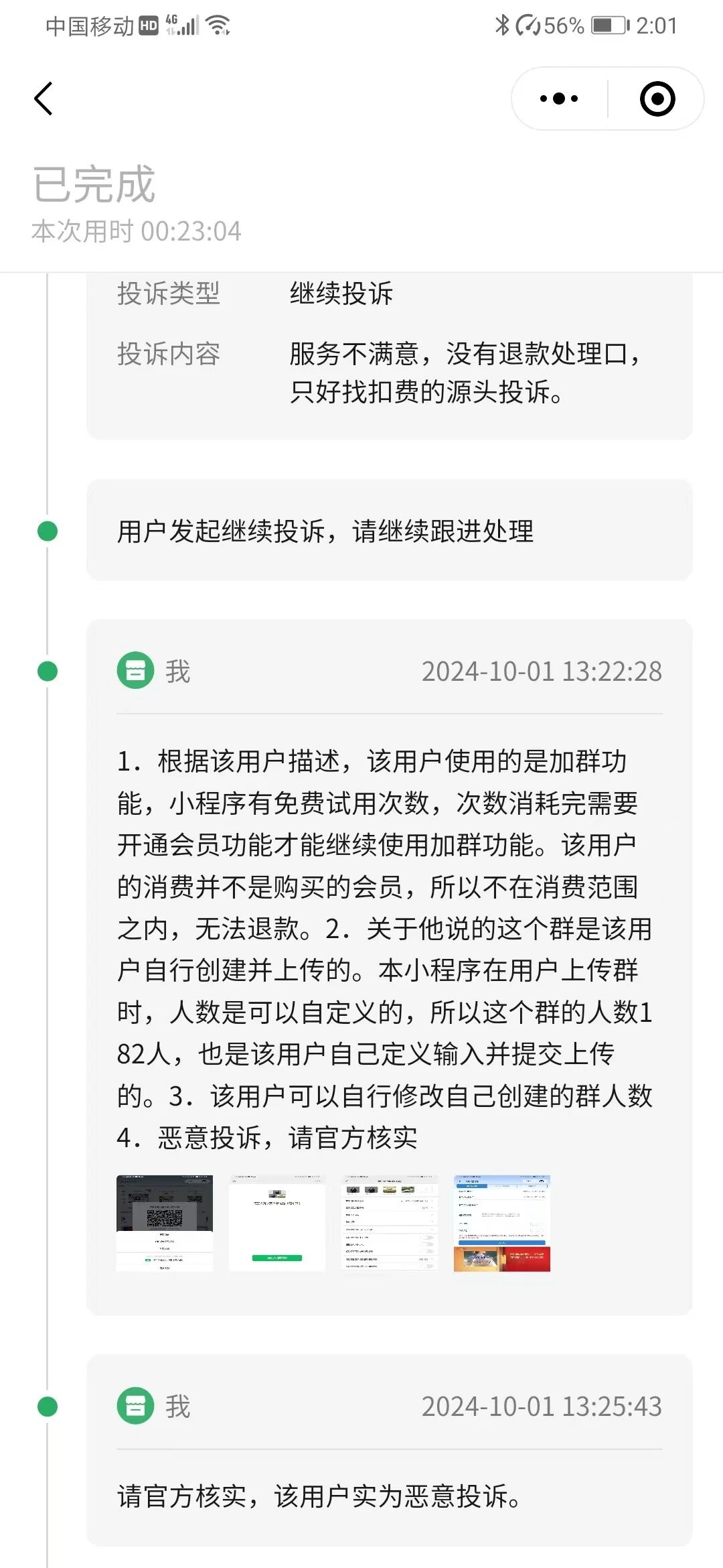 如图。我们是小程序,这个用户充值了50元买了积分。他消耗了部分积分,并使用了我们小程序的同步分发功能(一旦使用,就无法撤回了),然后跑来投诉申请退款。这个用户先是说虚假人数显示,不满意投诉退款。我提供证据说这个人数明明是他自己上传时,自己填写的,并且他使用的是会员功能,与他充值积分是没关系的。提供证据后,他又改口说服务不满意。再次举证,使用我们小程序后,已经陆陆续续有人进他的群,只要有人进群就是有效果了。他已经使用了我们的服务,并且消耗了积分,是不支持退款的。目前此人还在不断发起投诉,请问大家这种情况怎么处理?只能任由他白嫖吗?请问微信小程序官方,是不是所有的投诉,只要用户说服务不满意,就一定要给他退款?
