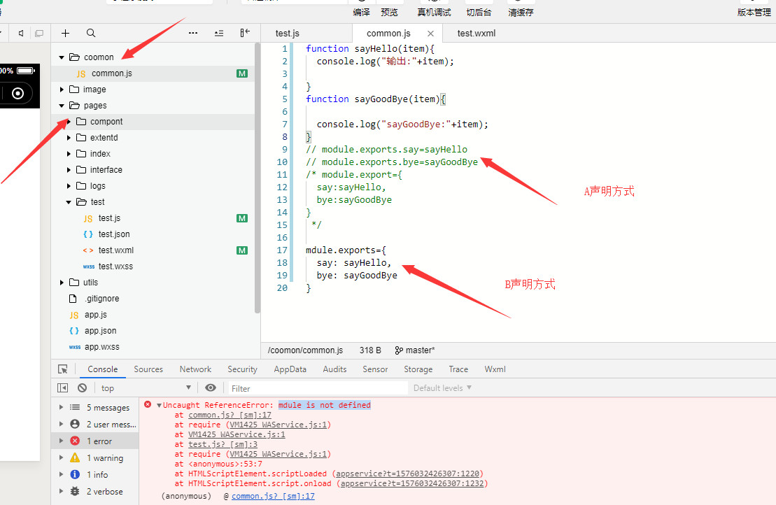 var common=require("../../coomon/common.js")hello:function(){ common.say("我是hello");},byebye:function(){common.bye("我是byby");}, |