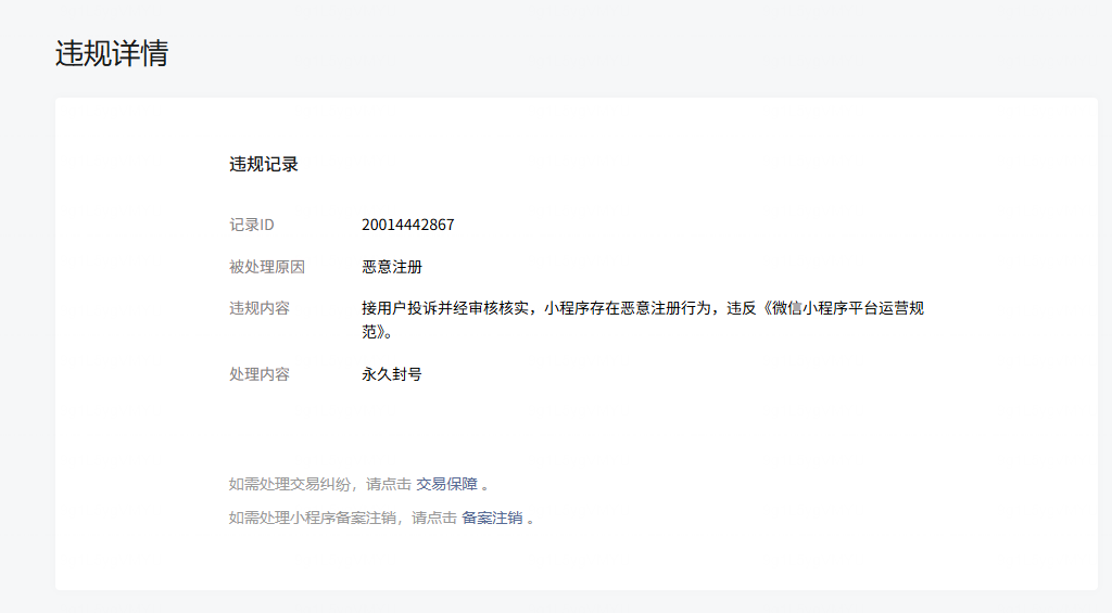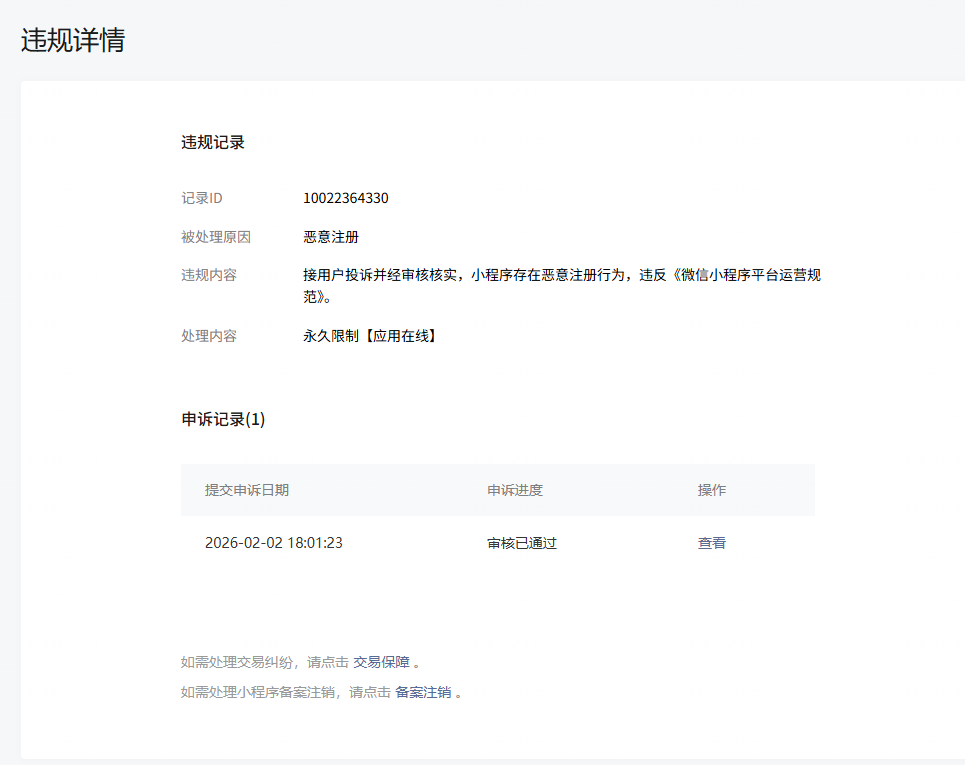 我连备案都没走完,版本已发布,但是是用户搜索不到的状态, 结果就说接到用户投诉被永久封号,而且我交了30块钱微信认证,前脚认证通过了,后脚就给我封号处理