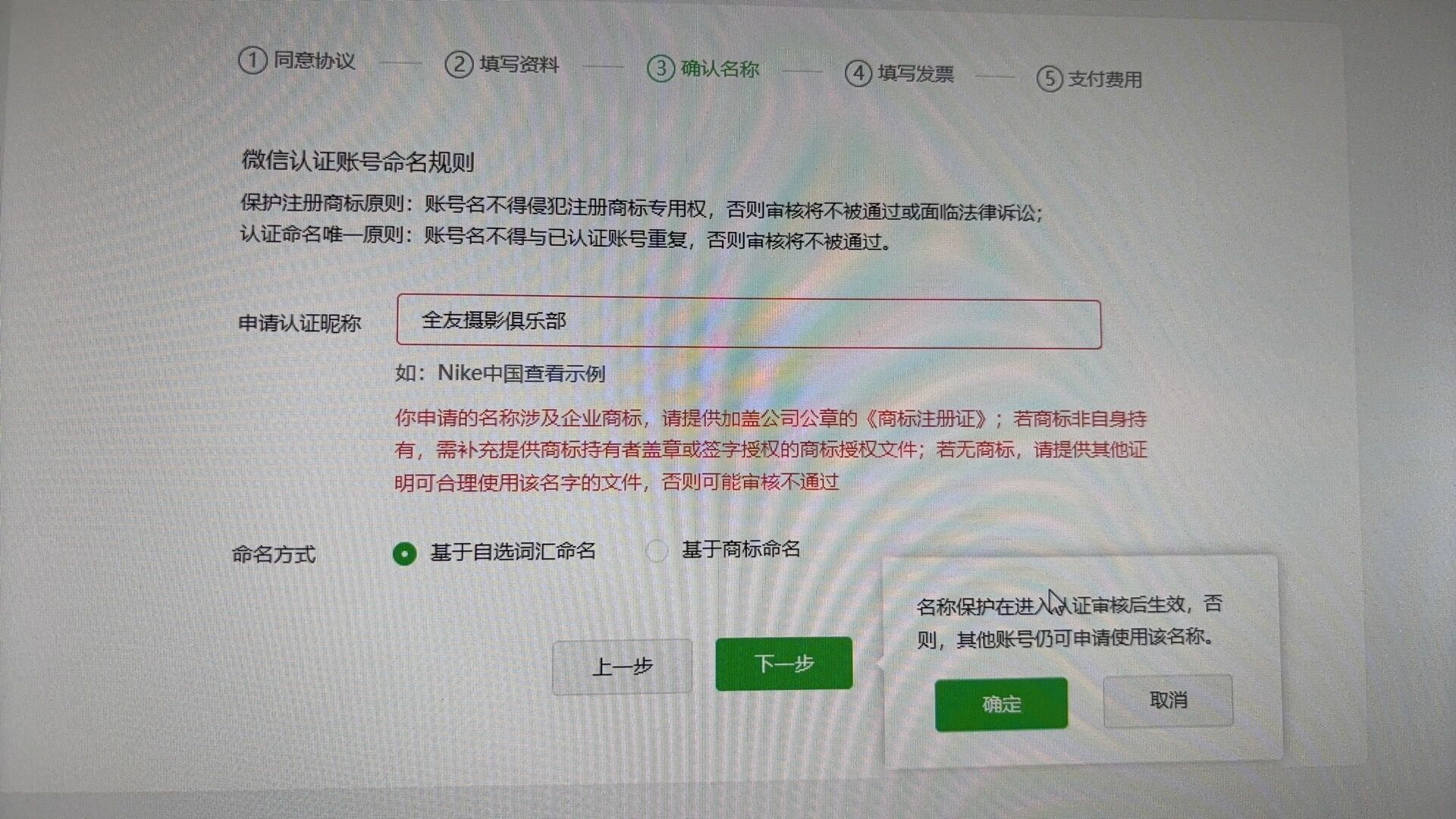 小程序年审,申请认证昵称默认是公众号的,带年纪下一步,提示这个咋解决,去年还可以的