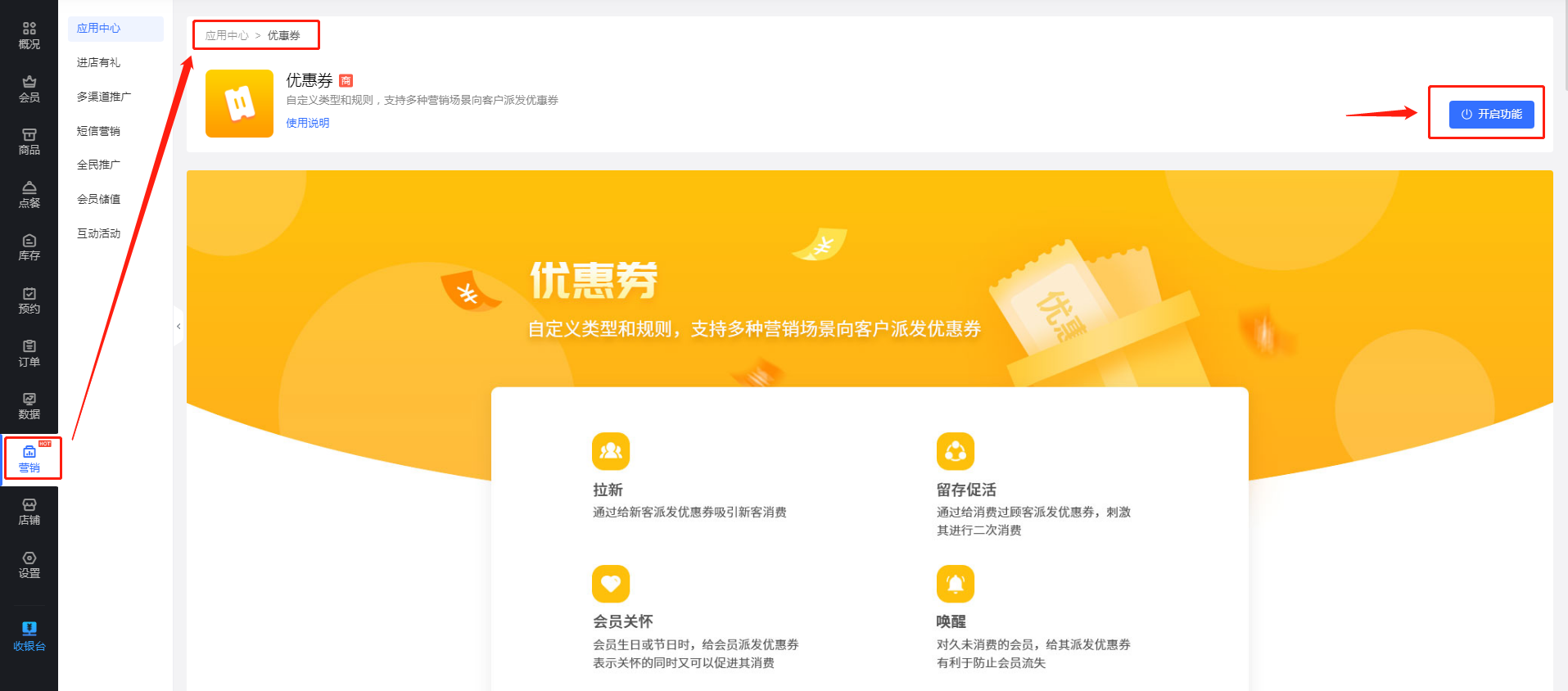 点击【营销】-【应用中心】-【会员储值】,开启功能
