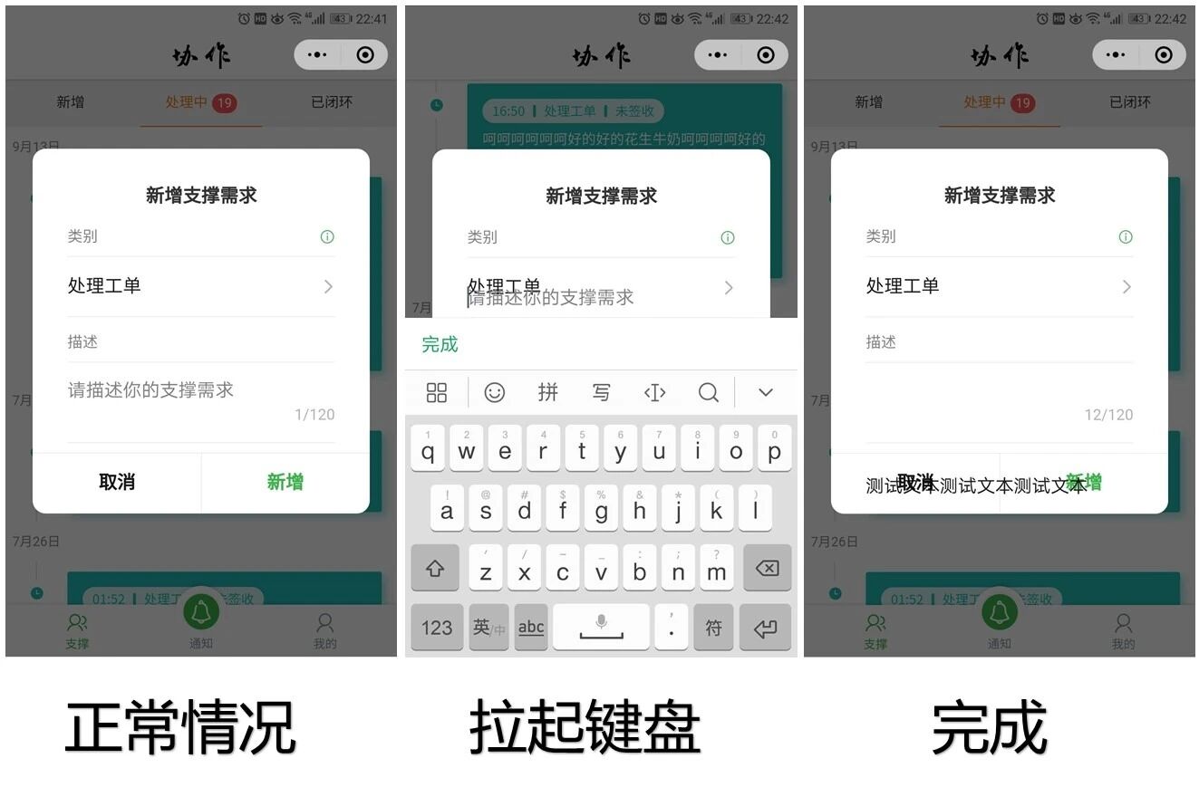 存在问题,textarea拉起键盘时,textarea跟随页面上推,但dialog不跟随上推,导致textarea错位。是否有解决方案?请指教,谢谢。