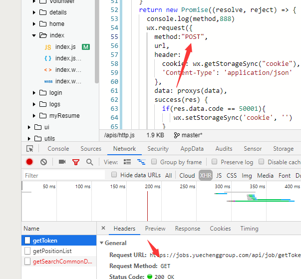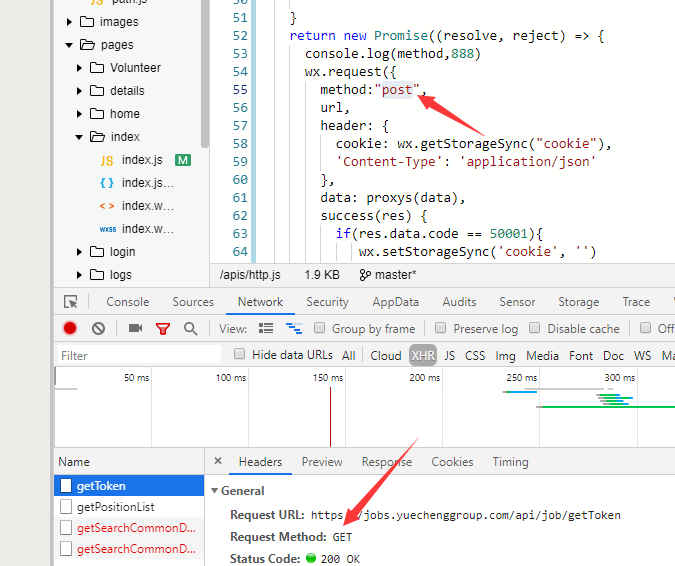 我代码写的是POST 开发者工具 给我是get 到底是为什么