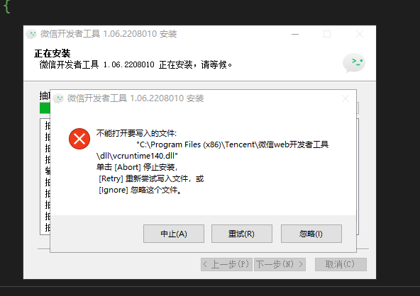 你这个把开发者工具后台关了程序安装,你有程序在运行肯定安装不了