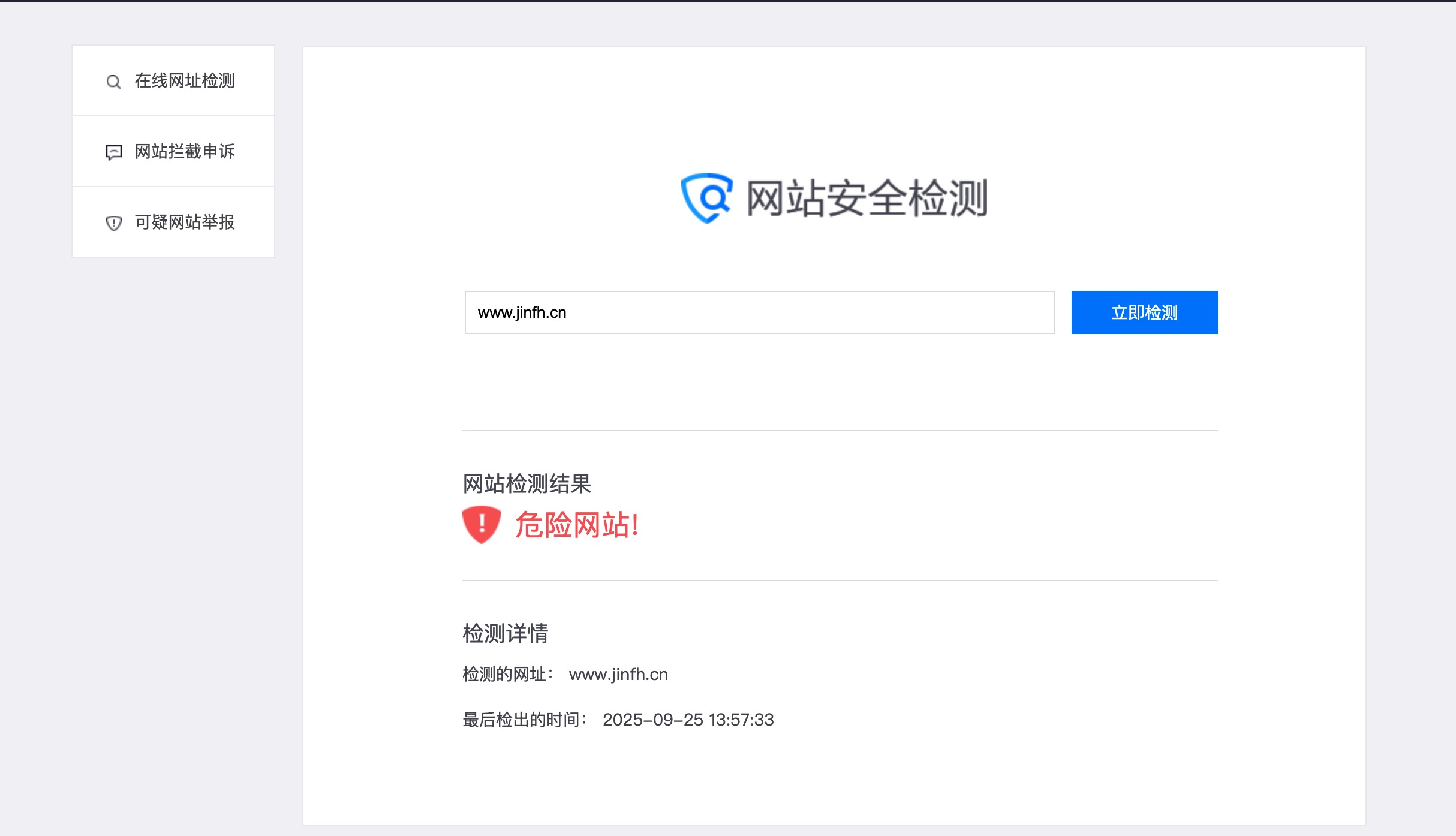 你好,域名www.jinfh.cn新注册的域名,绑定了网站出现提示:已停止访问该网页 网页包含诱导分享、关注等诱导行为内容,为维护绿色上网环境,已停止访问,这个是公司网站只用于鞋底产品的展示与公司介绍宣传,没人任何诱导分享关注诱导等行为,麻烦核实,谢谢