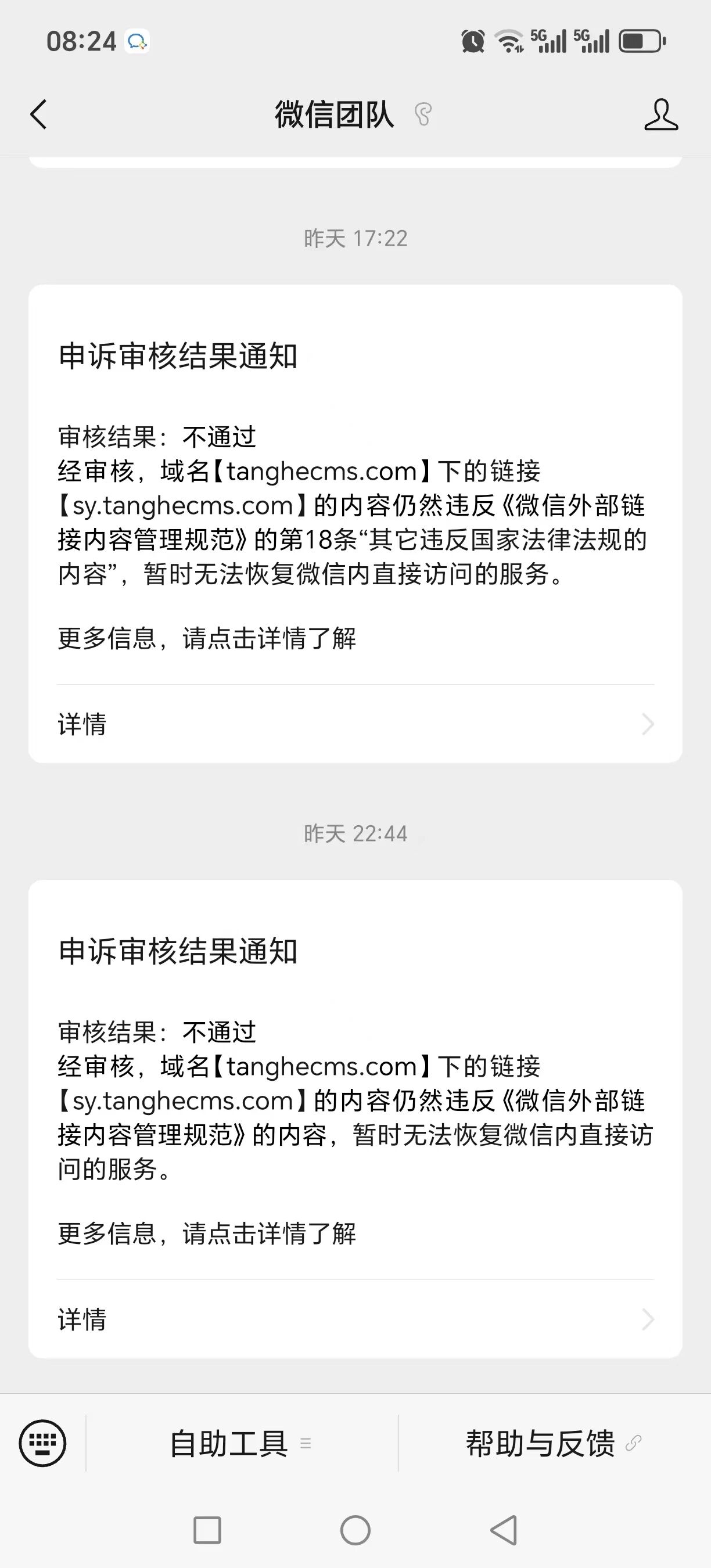 2026-01-27申诉审核结果通知:审核结果:不通过,经审核,域名【tanghecms.com】下的链接【sy.tanghecms.com】的内容仍然违反《微信外部链接内容管理规范》的第18条“其它违反国家法律法规的内容”,暂时无法恢复微信内直接访问的服务。