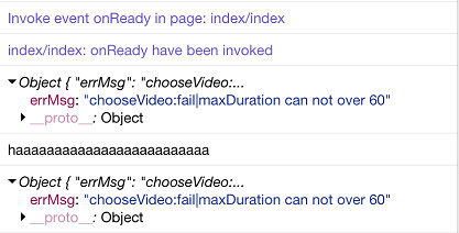 在ios中, maxDuration大于60则wx.chooseVideo无任何响应,小于等于60则正常调用wx.chooseVideo。sourceType=‘album’并且maxDuration不大于60时,maxDuration无效果;sourceType=‘camera’ 并且maxDuration不大于60时,maxDuration的长度可以正常截止摄像头录制。