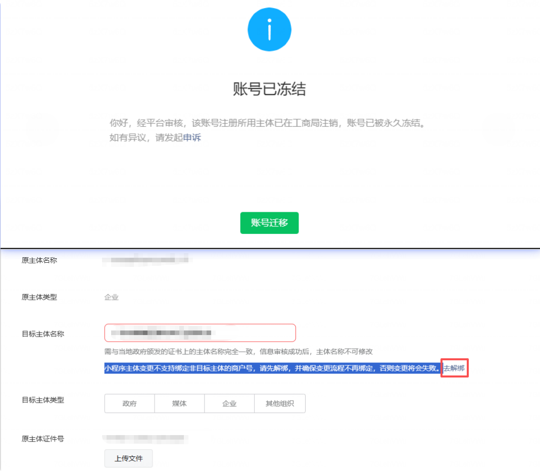 我小程序旧主体注销了,现在小程序登录不上去,想要变更主体,然后变更主体提示要解绑商户号。 但是解绑商户号需要登录小程序后台...现在又登不上去 那不是死循环了吗?商户后台我倒是可以登,但是商户后台不能解绑小程序