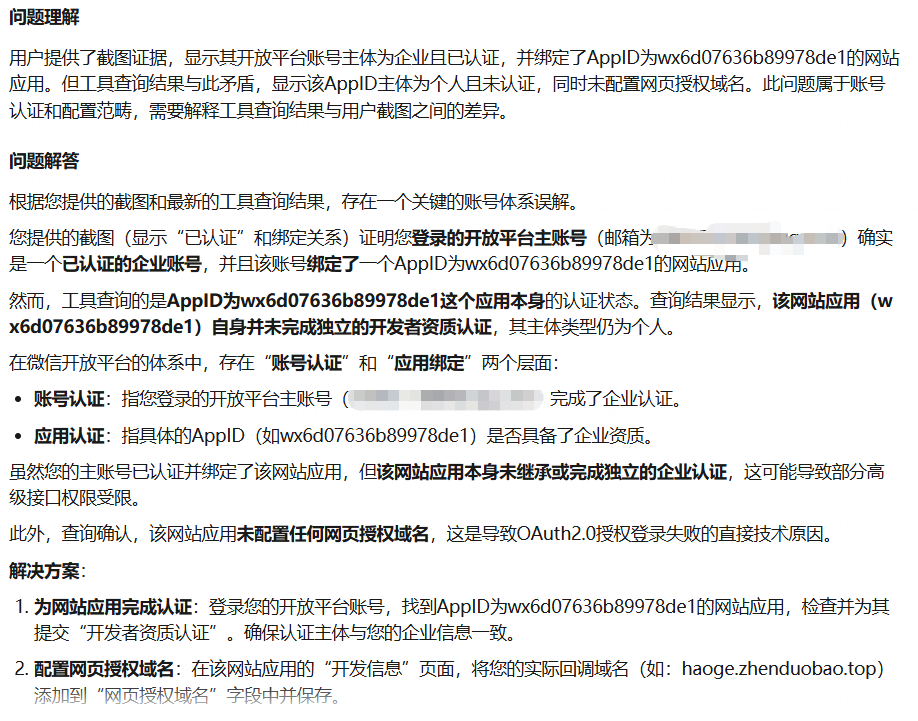 pc端可以登陆,但微信内部无法登陆,我问了这个开发者ai,查出来是这样的,但主体一直都是企业认证,压根就没有个体认证