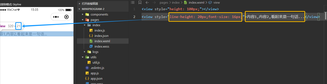 <view style="line-height: 20px;font-size: 16px;">内容1,内容2,看起来是一句话...</view>