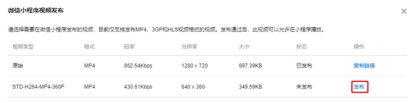 需要在腾讯云 - 视频资源里面,让视频通过审核,再点击右上角的“小程序视频发布”按钮,发布一下,就可以播放了