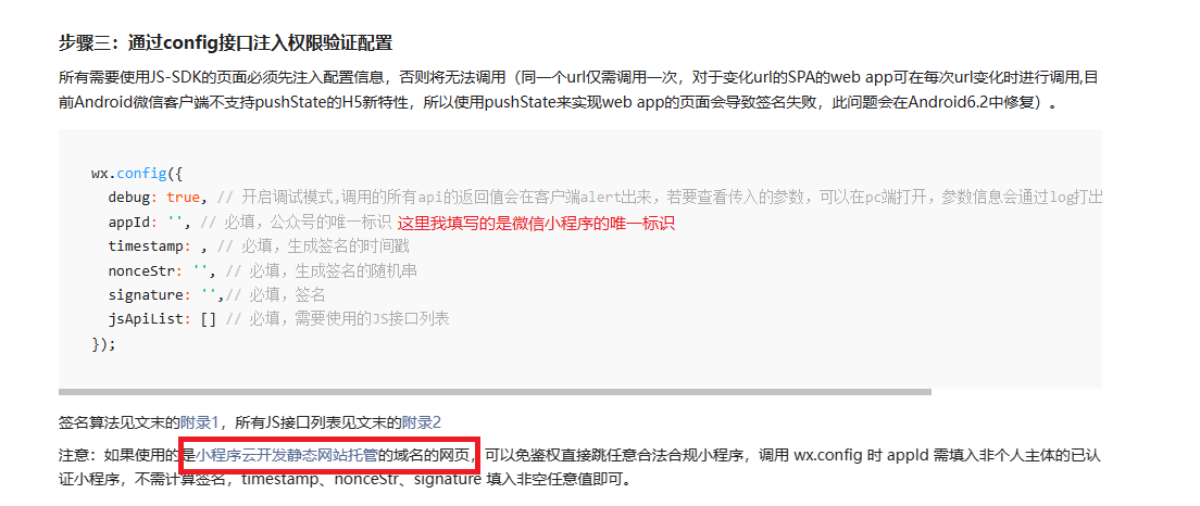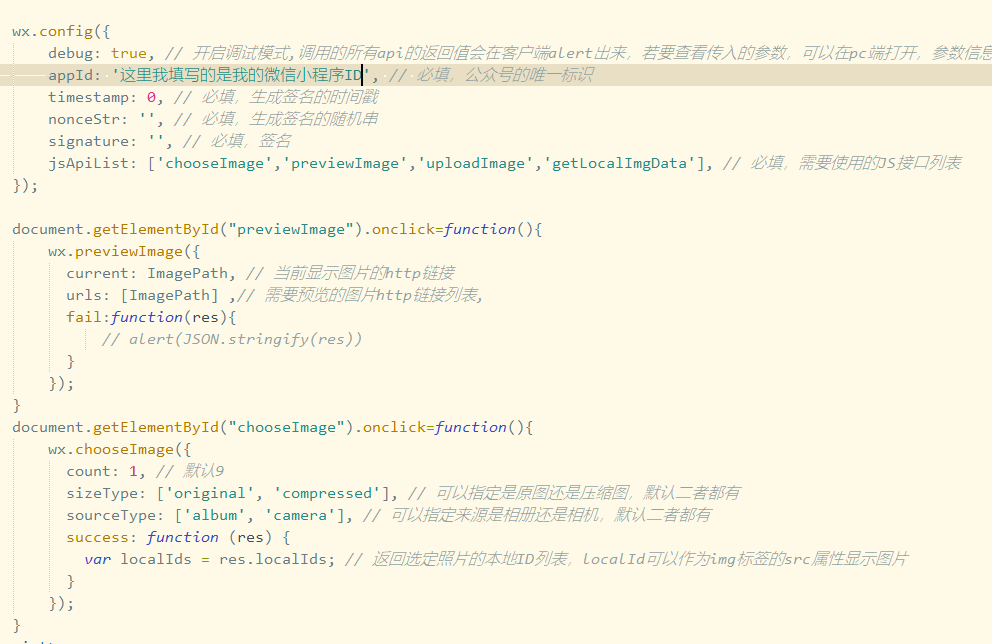 - 该网页调用jssdk,下面的配置项,只把appId写成了小程序的唯一标识(注意这里是小程序的唯一标识,不是公众号的,我知道填写公众号的该怎么弄。我之所以填写小程序的唯一标识,是因为小程序唯一标识+ 云开发静态网站托管,可以做到免鉴权!!!)
