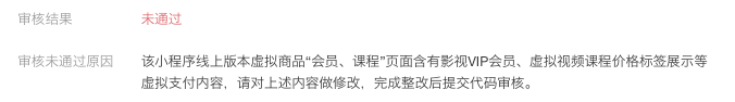 该小程序线上版本虚拟商品搜索“会员、课程、视频”页面含有影视VIP会员、虚拟视频课程价格标签展示等虚拟支付内容,请对上述内容做修改,完成整改后提交代码审核。
