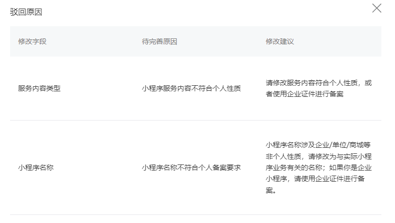 1.小程序服务内容不符合个人性质,请修改服务内容符合个人性质,或者使用企业证件进行备案。