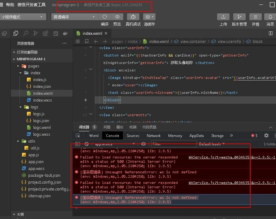 Failed to load resource: the server responded with a status of 500 (Internal Server Error)(env: Windows,mp,1.05.2204250; lib: 2.9.5)